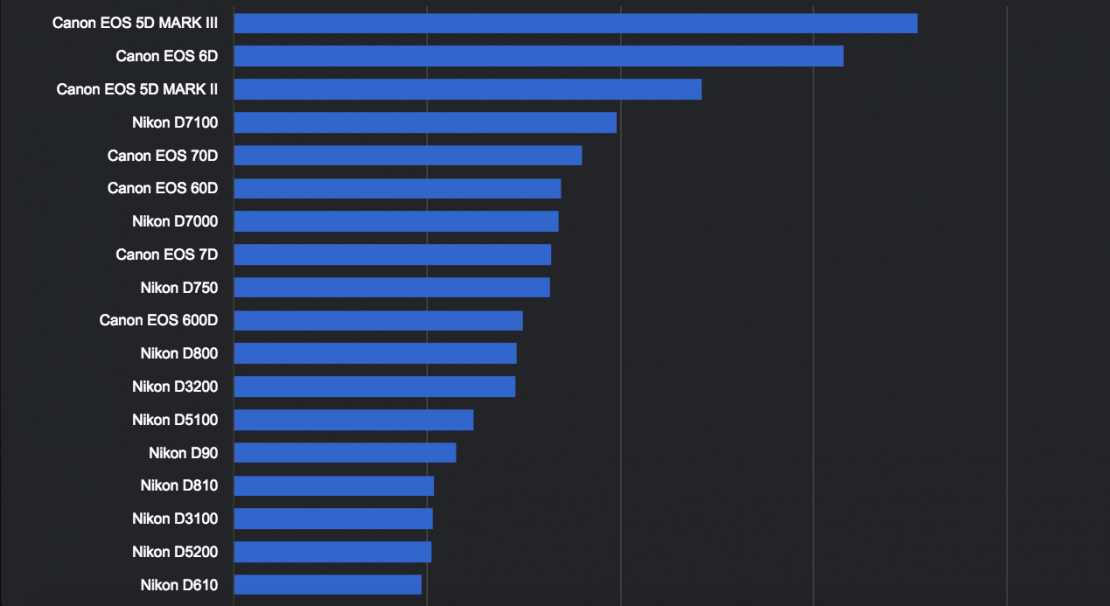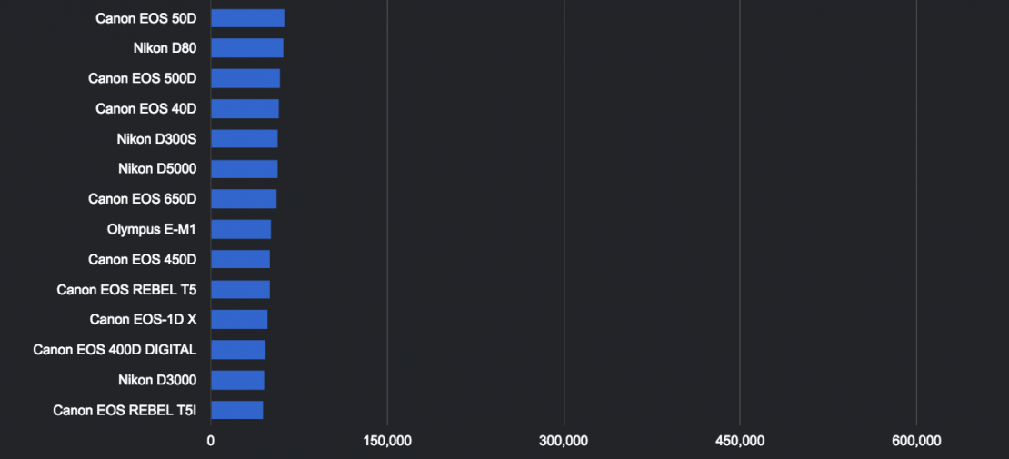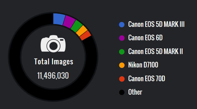 ExploreCams tiene una enorme base de datos de fotos que han sido publicadas en la web en sitios como Flickr, 500px o Pixabay. A partir de ahí han realizado una estadística con casi 12 millones de fotos sobre las cámaras digitales de óptica intercambiable, así como del conjunto de cámara y lente, que se han utilizado para realizar dichas fotos, tras lo cual han creado una infografía con el top 50 de las cámaras más utilizadas, así como el conjunto de cámara y lente más utilizadas.