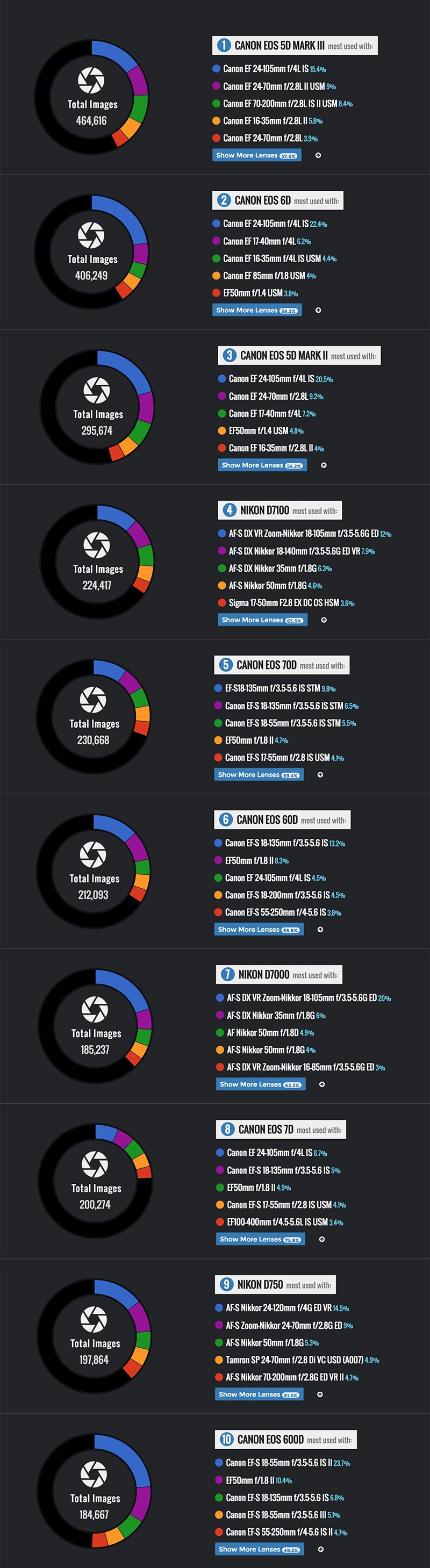 Puedes ver el listado completo de los 50 conjuntos de cámara y lente más utilizados pinchando en este enlace aquí. Y no sólo eso, sino que también podrás ver los ajustes de ISO, modo de exposición, velocidad de exposición y apertura más utilizados en las principales cámaras pinchando aquí.
